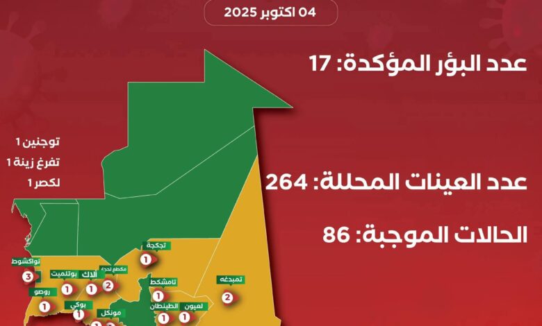 وقد سجلت المصالح البيطرية، حتى يوم 4 اكتوبر 2025 ،ما مجموعه 17بؤر ة موزعة على 15 مقاطعة تتبع لثمان ولايات ,كما هو موضح في الصورة
