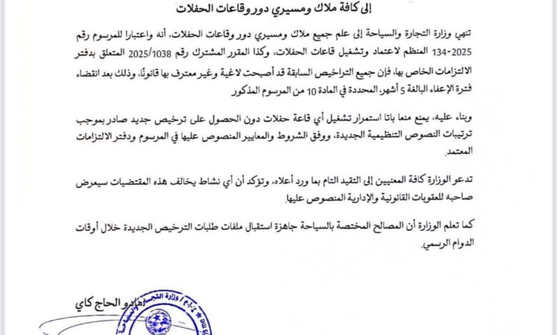 أعلنت وزارة التجارة الموريتانية إلغاء جميع تراخيص دور وقاعات الحفلات القديمة ، جاء ذلك في البيان المرفق: