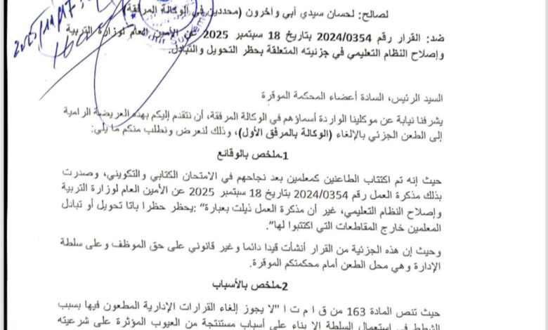 فقد دأبت وزارة التربية ومنذ عام 2023 وإلى حد الساعة على حرمان المدرسين الخريجين من حق التبادل وحق التحويل وحق الاستفادة من الملفات الصحية إضافة إلى حرمانهم من حق لمِّ الشمل وحق المرافقة المرضية ، وهو ما حدا بتلك الدفعات إلى الطعن في هذا القرار الجائر والمشين بعد استفراغ الوسع والجهد في الحلول الدبلوماسية… والتي لم تجد وللأسف آذانا صاغية لدى الوزارة بل لطالما قوبلت بالرفض والألفاظ النابية وخاصة من مدير المصادر البشرية في الوزارة.