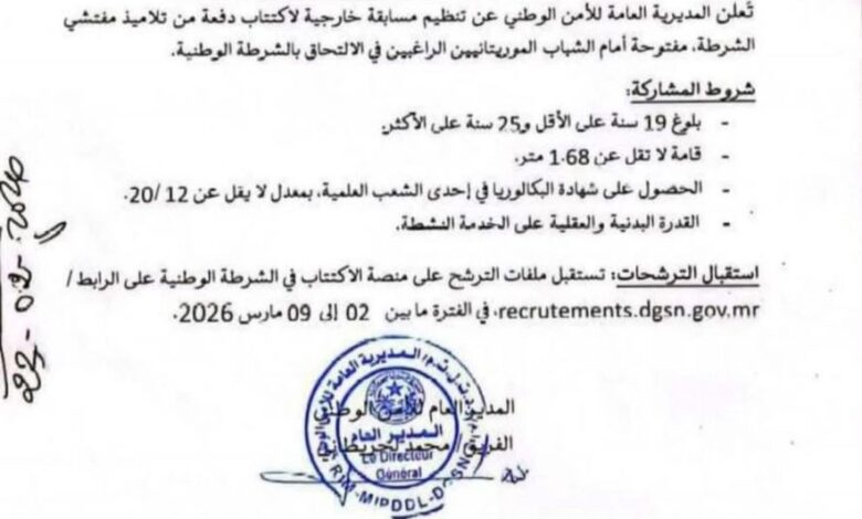 أعلنت الشرطة الوطنية اليوم عن اكتتاب بدفعة جديدة من المفتشين ، مشتركة أن يكون المرشح حاصلاً على الباكالوريا العلمية ، وأن يكون موريتانيا ، وهذه نسخة من الإعلان: